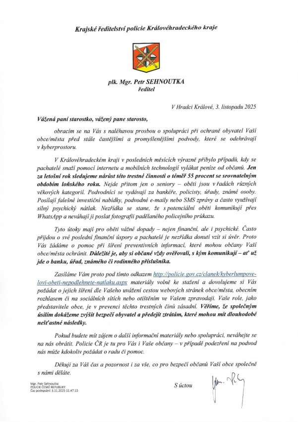 V příloze zveřejňujeme dopis Krajského ředitelství policie Královéhradeckého kraje, který se týká stále častějších a promyšlenějších podvodů, které se odehrávají v kyberprostoru. Jen za letošní rok přibylo v Královéhradeckém kraji nárůst podvodů v téměř 55 procent.