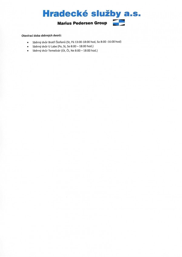 V roce 2022 naše obec zajistila dohodu se společností Hradecké služby, a.s. na ukládání odpadů od našich občanů na jejich sběrném dvoře.