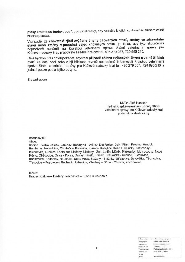 V případě, že chovatelé zjistí zvýšené úhyny chovaných ptáků, změny ve zdravotním stavu nebo změny v produkci vajec chovaných ptáků, je třeba, aby tyto skutečnosti neprodleně oznámili na Krajskou veterinární správu Státní veterinární správy pro Královéhradecký kraj, pracoviště Hradec Králové tel. 495 279 057, 720 995 210.