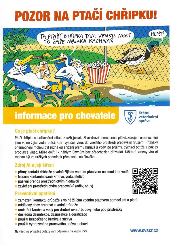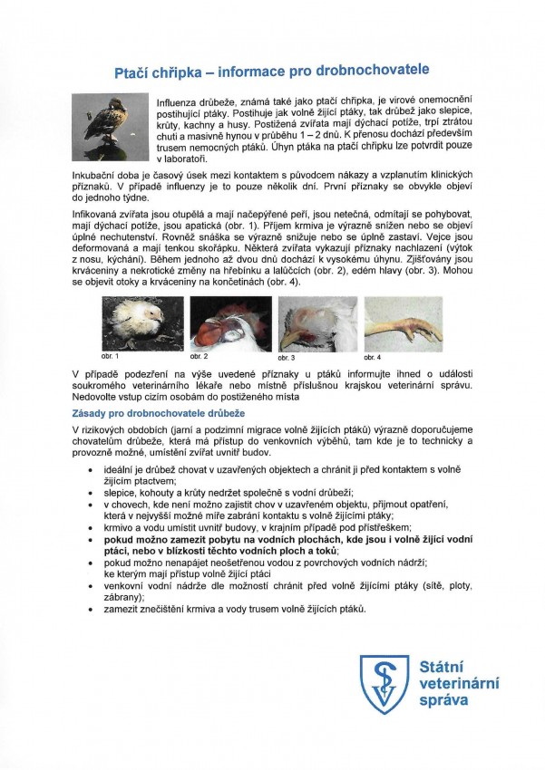 V přílohách zveřejňujeme informaci SVS o zjištění ptačí chřipky a informační letáky pro drobnochovatele, jak zajistit svoje chovy.