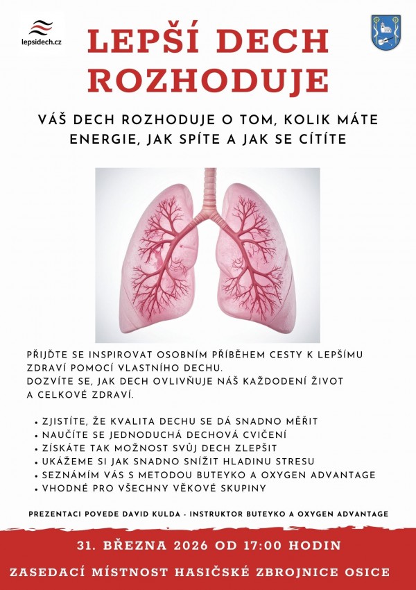 Obec Osice zve občany na přednášku "Lepší dech rozhoduje", která proběhne v úterý 31. března 2026 od 17,00 hodin v za sedací místnosti hasičské zbrojnice Osice.