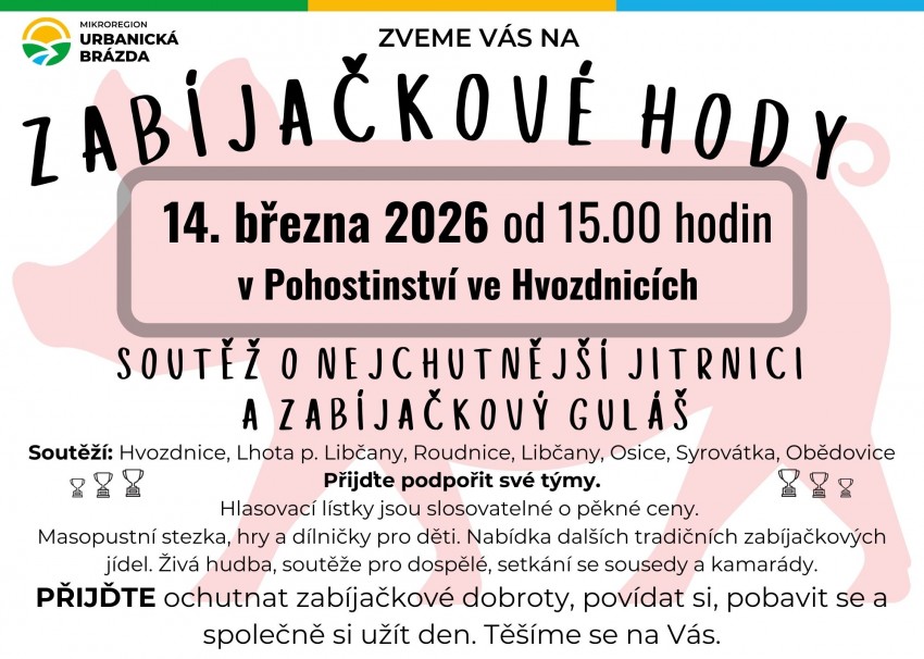 V příloze zveřejňujeme pozvánku na zabíjačkové hody - v pohostinství ve Hvozdnicích se v sobotu 14. března 2026 utkají týmy z obcí mikroregionu v soutěži o nejchutnější jitrnici a zabíjačkový guláš.