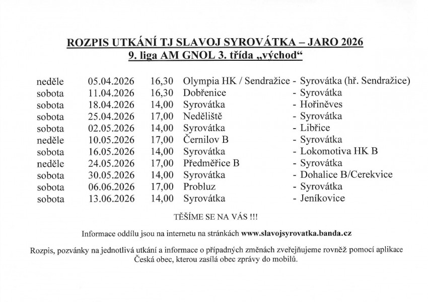 TJ Slavoj Syrovátka - rozpis fotbalových utkání jaro 2026