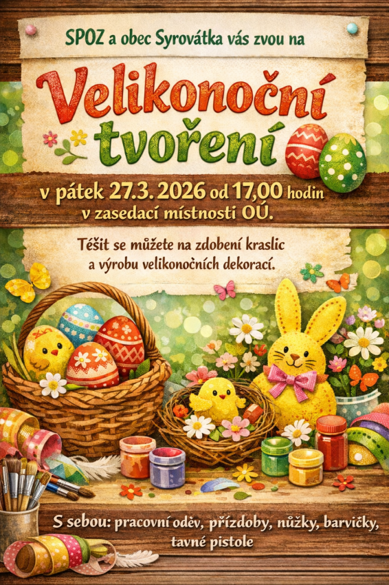 Zveme všechny děti i jejich rodíče na Velikonoční tvoření, které se koná v pátek 27. března 2026 od 17,00 hodin v zasedací místnosti Obecního úřadu.